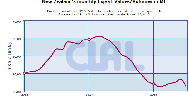 New Zealand exports in July 2015 compared to July 2014 increased in volumes for Caseinates (+46.0%), Whey Powder (+36.3%), Cheese (+33.5%), WMP (+22.9%), Casein (+14.1%), Butter (+10.9%) while decreased for SMP (-17.7%).