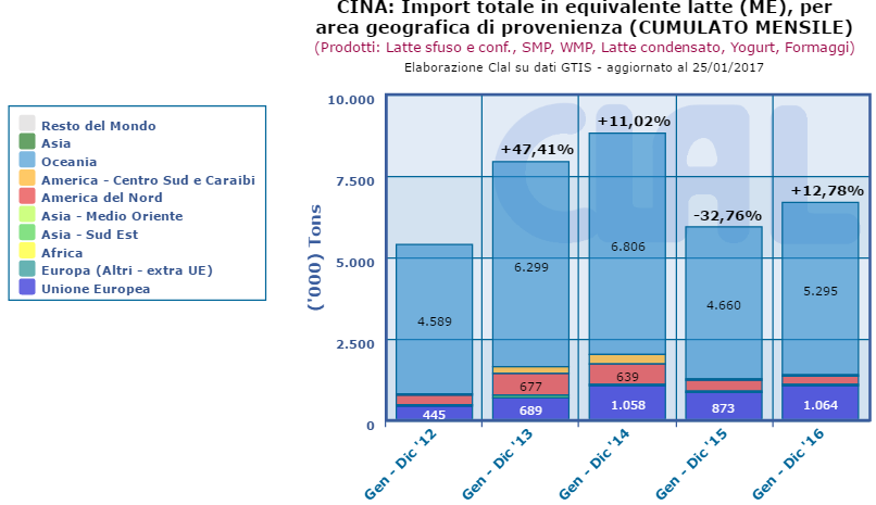 La Cina chiude il 2016 con un aumento delle importazioni lattiero casearie del 20% in volume e del 12% in valore.