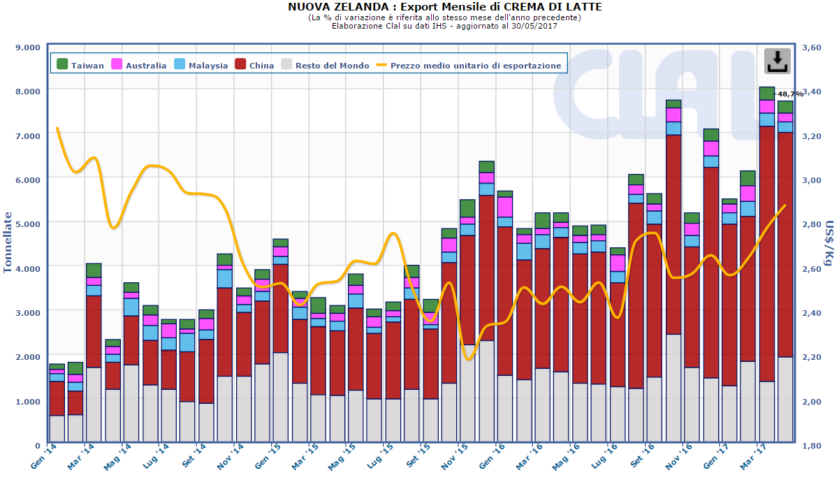 Anche il prezzo medio unitario delle esportazioni di crema di latte dalla Nuova Zelanda sta crescendo ininterrottamente. Da gennaio ad aprile è passato da 2,55 $/kg a 2,87 $/kg.