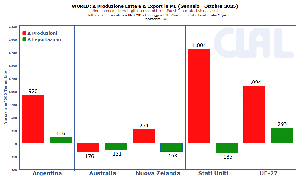 È quello che sta accadendo oggi in USA, UE-27, Argentina e Nuova Zelanda, dove l’aumento della disponibilità non trova pari sbocchi sui mercati mondiali, contribuendo a un contesto di pressione sui prezzi.